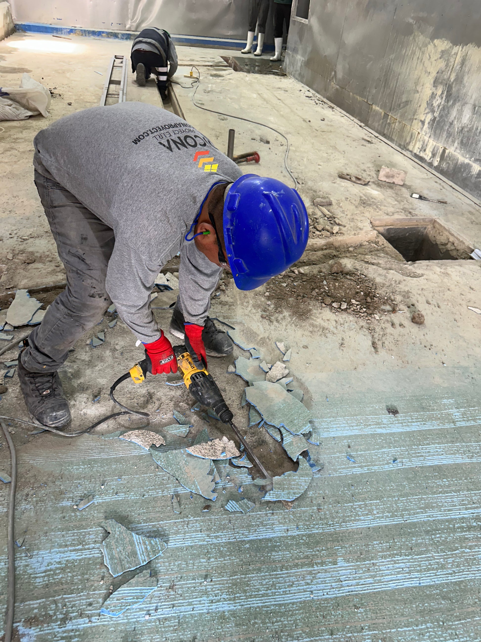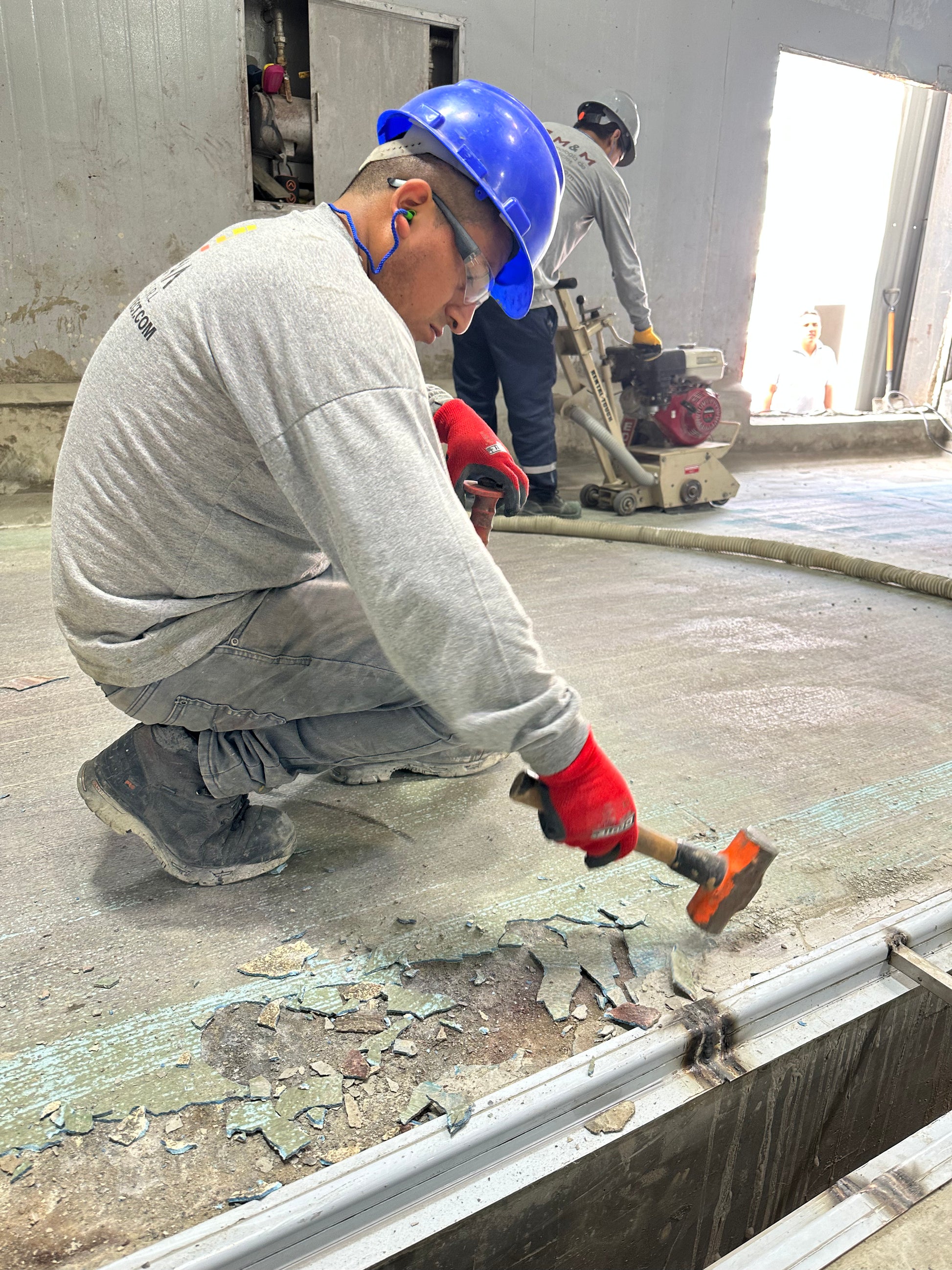 Retiro total del piso dañado y preparación de superficie mediante escarificado mecánico para lograr un perfil de anclaje óptimo (Grado CSP6).